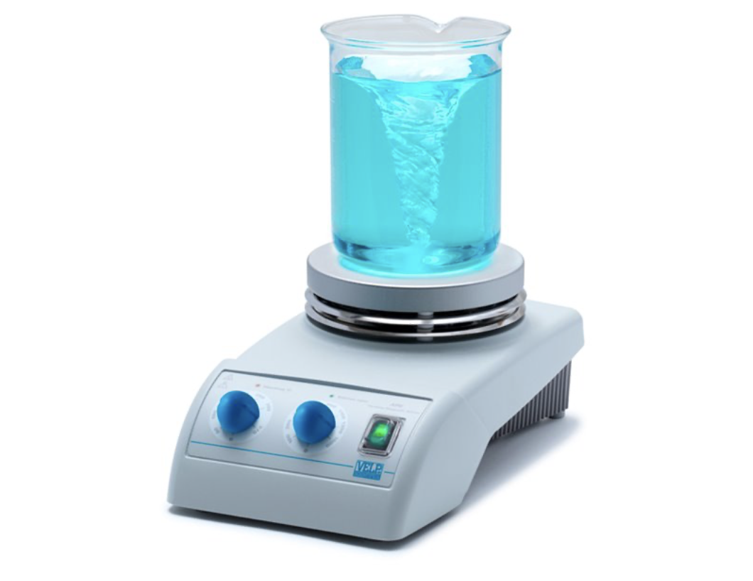 By turning the left knob of the hot plate stirrer it is possible to adjust the temperature (up to 370 °C), whilst the right one controls the stirring speed (up to 1500 rpm).