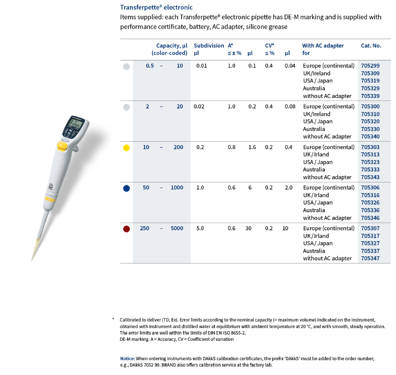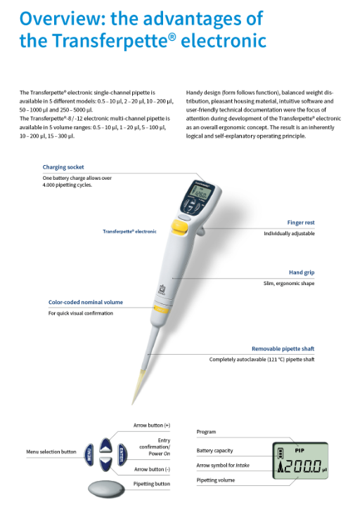 BRAND Transferpette® electronic, laboratuvar uygulamalarının çoğunda kullanılmak üzere geliştirilmiş ergonomik, sezgisel bir elektronik pipettir. Yumuşak dokunmatik pipetleme tuşu, ayarlanabilir parmak ucu, hafif ve yenilikçi uç konisi, statik zorlanma ve operasyonel güçleri en aza indirgeyerek tekrarlanan stres yaralanmaları riskini azaltır. OSHA tarafından akredite edilmiş bir test laboratuvarı olan prestijli TÜV test servisinden alınan "Ergonomics" onaylı ve "Kullanıcı Dostu" sertifikalarıyla ödüllendirilen ilk elektronik pipettir.