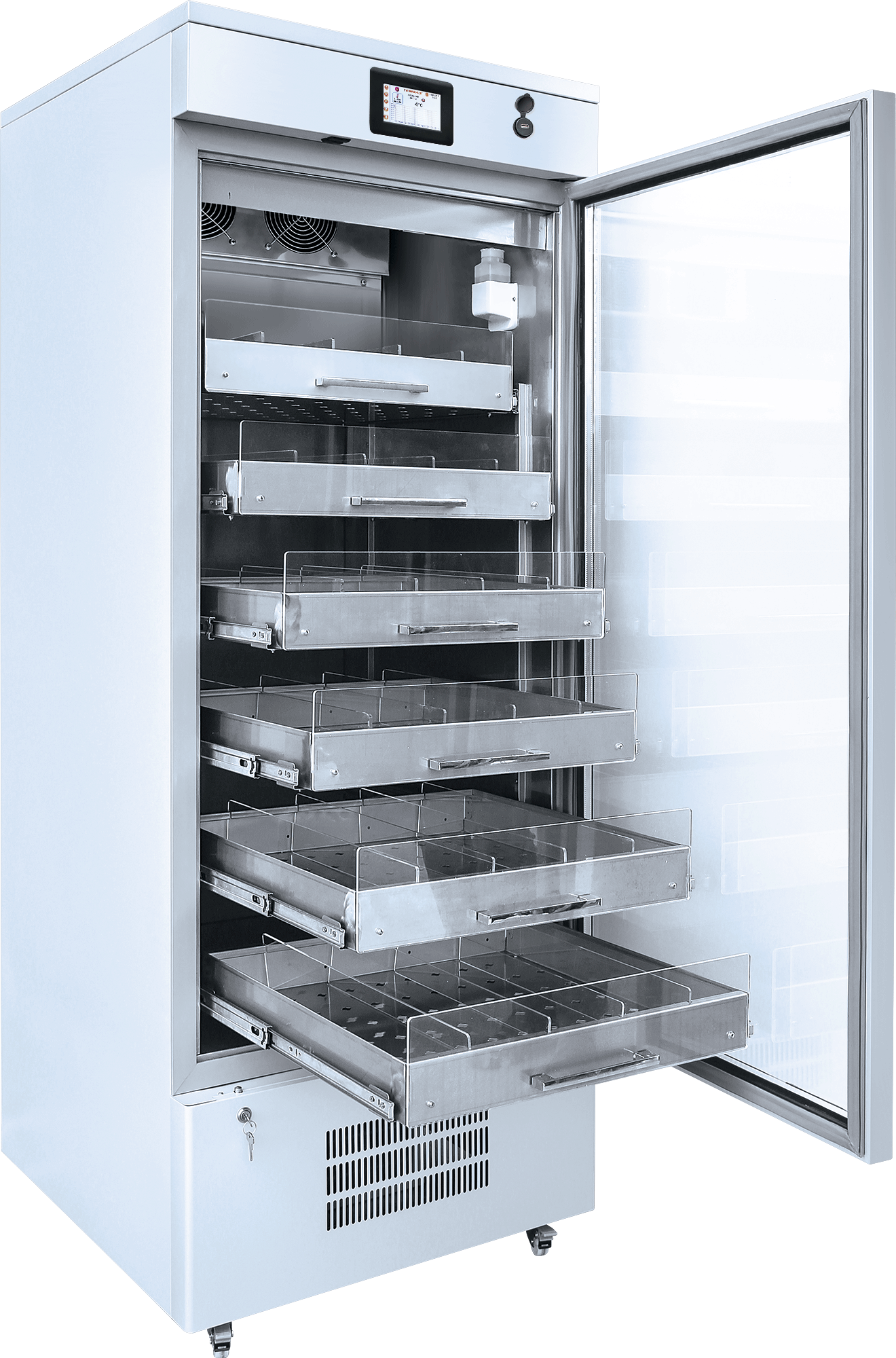 - Dolap, havuz tipi paslanmaz çelik raf sistemine sahiptir. Her bir raf önünde plexiglass koruyucu bulunur. Bu hareketli raf sisteminde kolay çekebilme özelliği mevcuttur. Kan torbalarının kolayca yerleştirilerek stoklanmasına yardımcı olan çekmece içi separatörler bulunmaktadır.