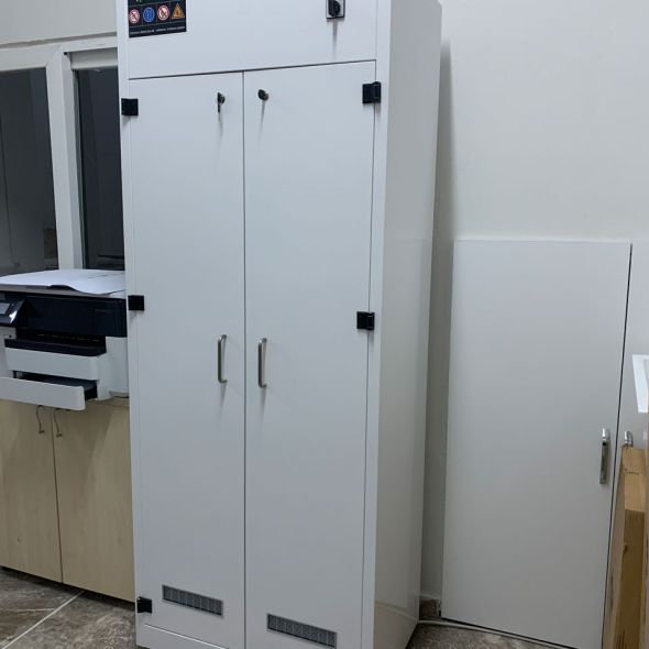 - Kimyasal madde saklama dolaplarının kapakları ve yan yüzeyleri çift cidarlı olup, cidarlar arasına takviye çelik yerleştirilmekte ve ısı izolasyonu, hava sirkülasyonu sağlaması açısından özel kanal sistemi ile donatılmıştır.