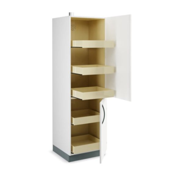 - Kimyasal madde dolaplarının üst kısmında dolap iç ventilasyonunun sağlanması amacıyla kanal tipi polipropilen fan kullanılmaktadır. Fan sistemi dolap ön yüzündeki pako şalter vasıtasıyla kumanda edilmektedir. Fan ventilasyon gücü dolap hacmine göre değişmektedir.