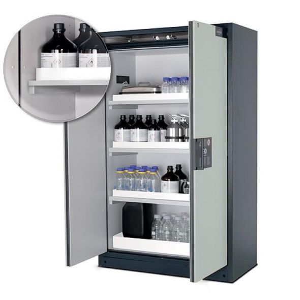 - Kimyasal madde dolaplarının içerisinde 4 adet çekmeceli raf sistemi mevcuttur. Raf sistemleri kimyasal madde dökülmelerinde sızdırmayı engellemesi amacıyla tava şeklindedir.