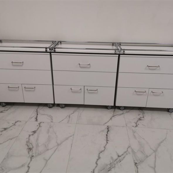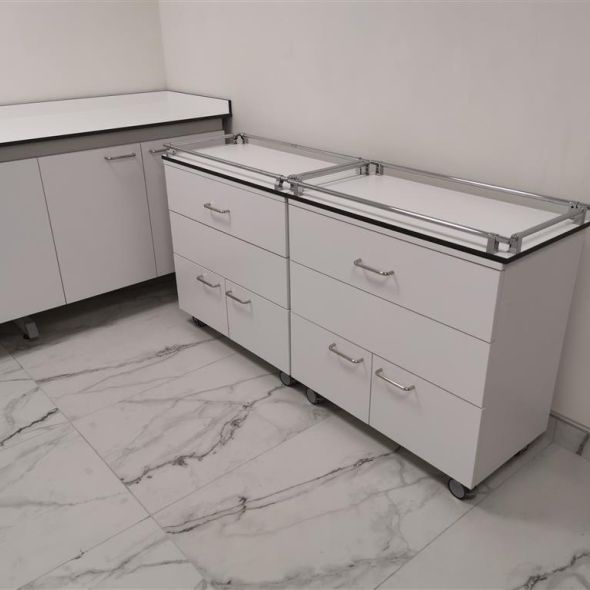Alt ve üst dolap laboratuvar mobilyalarında tercih edilen ekonomik sistemlerindendir. İhtiyaçlara göre oldukça fazla alternatif mümkündür. Kullanıcının ihtiyaçlarına ve taleplerine uygun olarak, çekmeceli, raflı modüler sistemler sağlanmaktadır. Kullanılacak olan aksesuarlar korozyona dayanıklıdır. 18mm kalınlığında birinci sınıf mdflamdan üretilen dolap ve kapak sisteminin kimyasal dayanımının arttırılması amacıyla anti asit laminant uygulanarak, kapak  kenarları 2mm PWC ile kaplanmaktadır. Çekmeceli tasarımlarda frenli teleskobik ray sistemi kullanılmaktadır.
